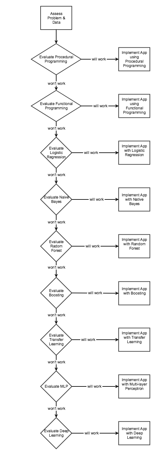 AI is great for solving problems that couldn’t be solved with classical computing, and improving performance in other areas. However, there has been too much fuss over having a lot of data and deep learning. This belief generally translates to either 1) only Google or Microsoft can come up with great AI products (because they have more data than anyone else), or 2) we need to have our big data infrastructure ready to incorporate AI. While having lots proprietary data, and a state of the art big data infrastructure can provide you a competitive advantage, not having it shouldn’t prevent you from venturing into / incorporating AI.