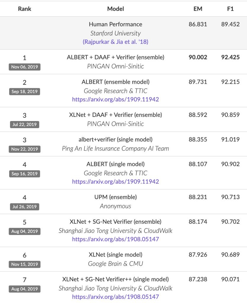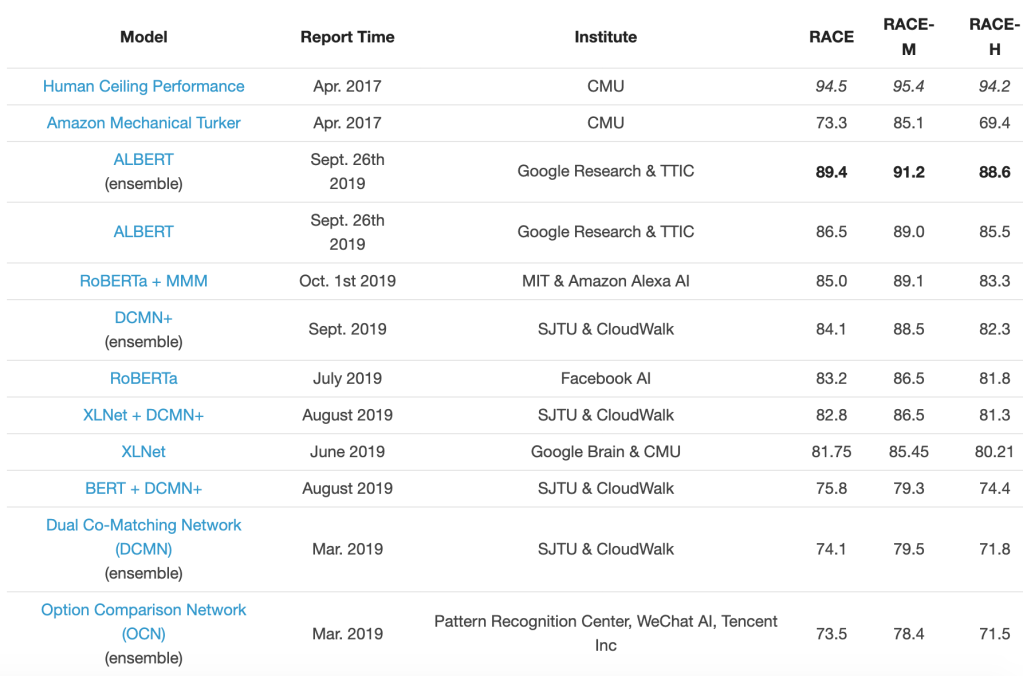 For detailed RACE results (or leaderboard), please refer to – http://www.qizhexie.com/data/RACE_leaderboard.html